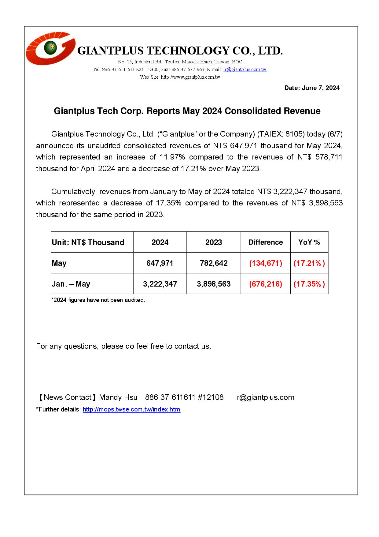 2024/06/07 Finance Giantplus Tech Corp. Reports May 2024 Consolidated Revenue Giantplus Tech Corp. Reports May 2024 Consolidated Revenue en.pdf