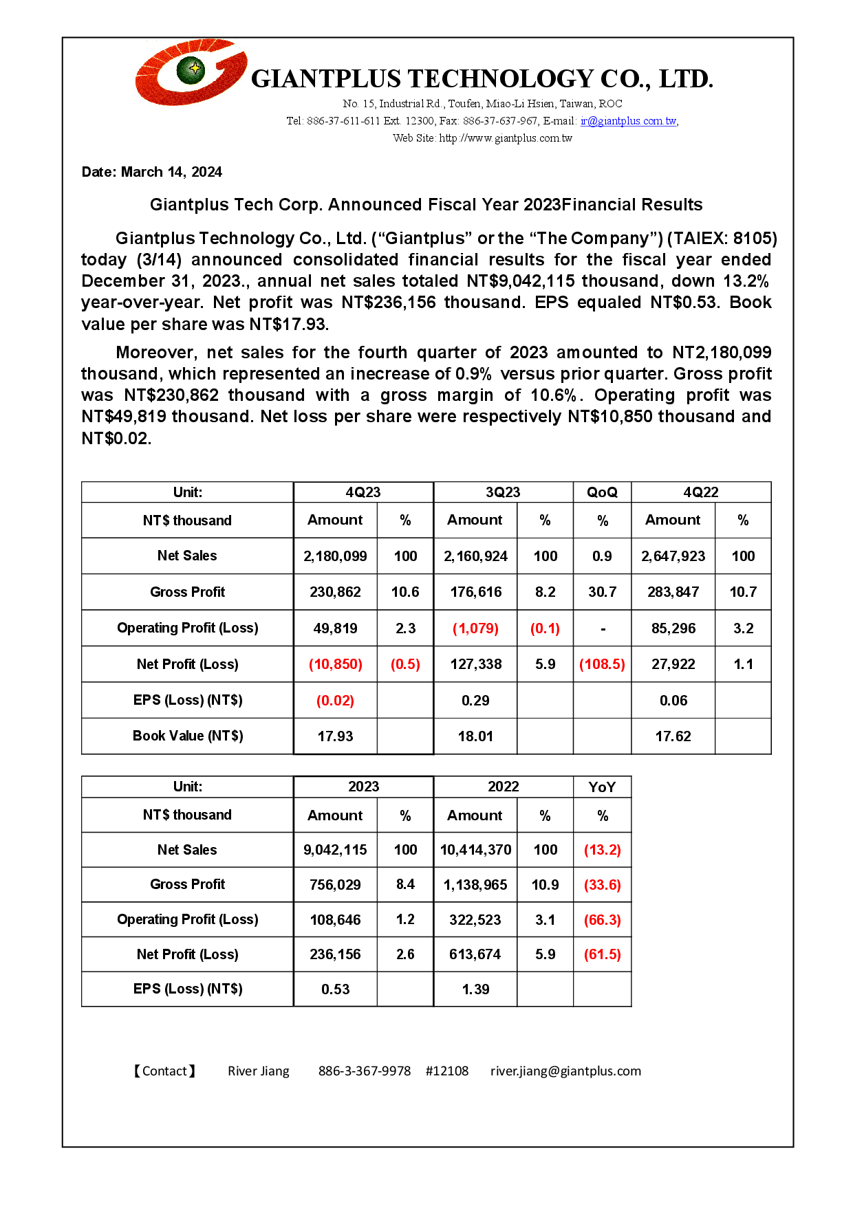 2024/03/14 Finance Giantplus Tech Corp. Announced Fiscal Year 2023Financial Results GiantPlus Technology Announced Fiscal Year 2023 Financial Results.pdf