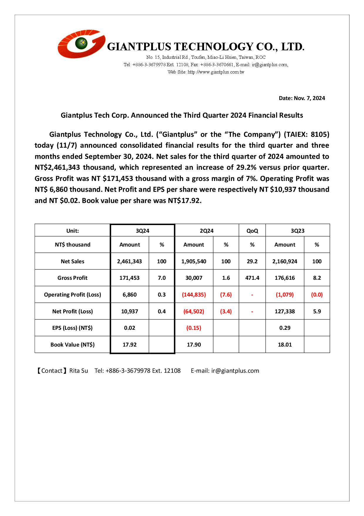 2024/11/12 Finance Giantplus Tech Corp. Announced the Third Quarter 2024 Financial Results GiantPlus Tech Corp. Announced the Third Quarter 2024 Financial Results.pdf