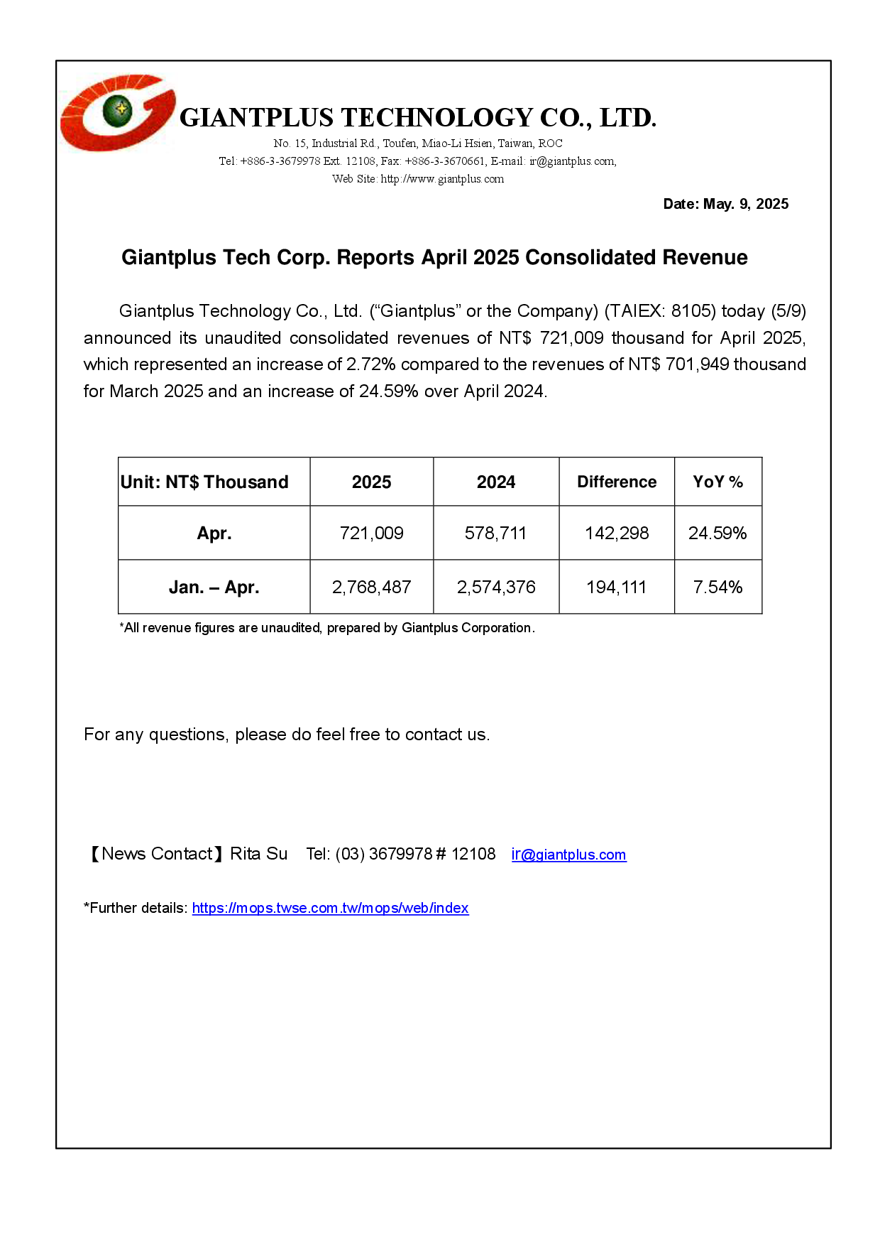 2025/05/09 Finance Giantplus Tech Corp. Reports April 2025 Consolidated Revenue Giantplus Tech Corp. Reports Apr 2025 Consolidated Revenue.pdf