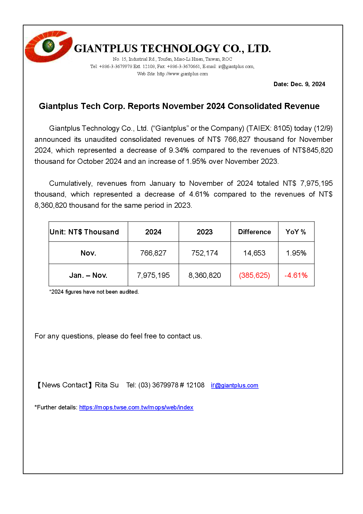 Giantplus Tech Corp. Reports November2024 Consolidated Revenue.pdf