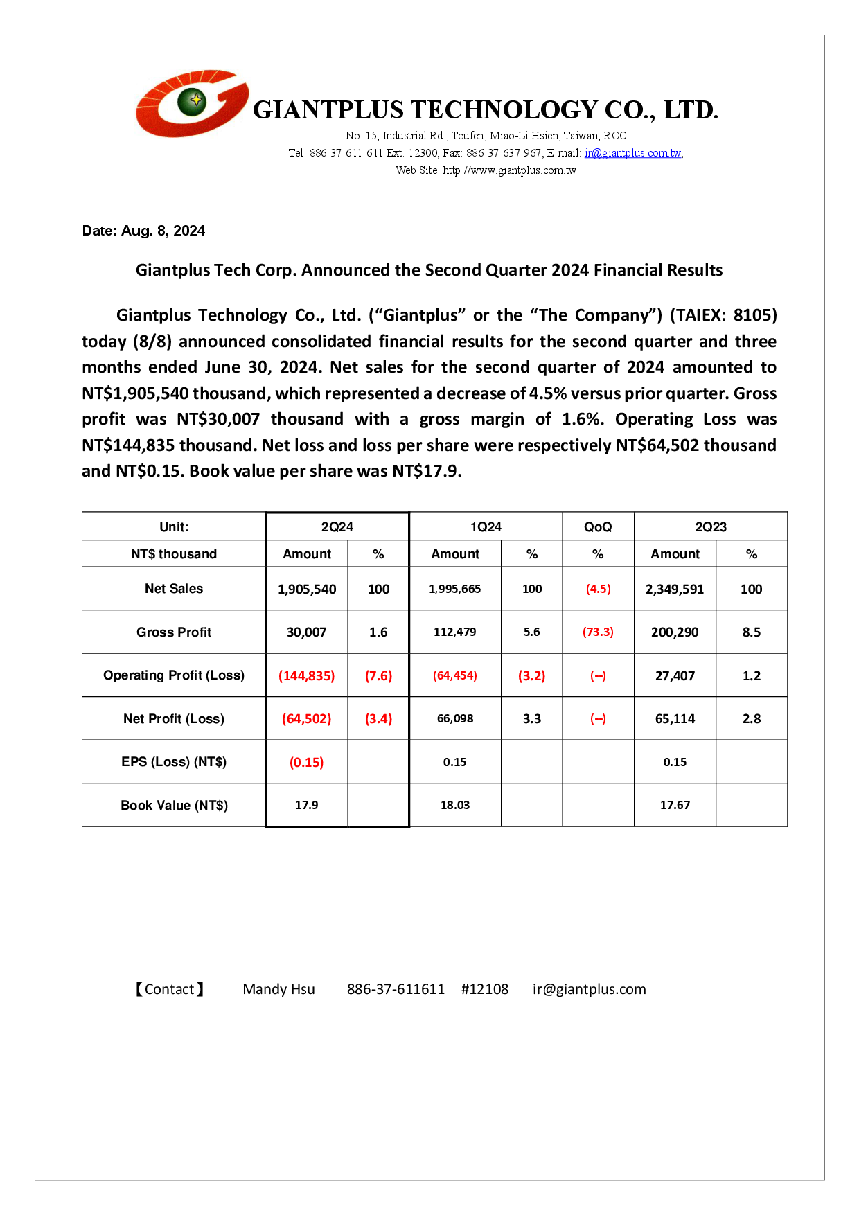 2024/08/08 Finance Giantplus Tech Corp. Announced the Second Quarter 2024 Financial Results GiantPlus Tech Corp. Announced the Second Quarter 2024 Financial Results en.pdf